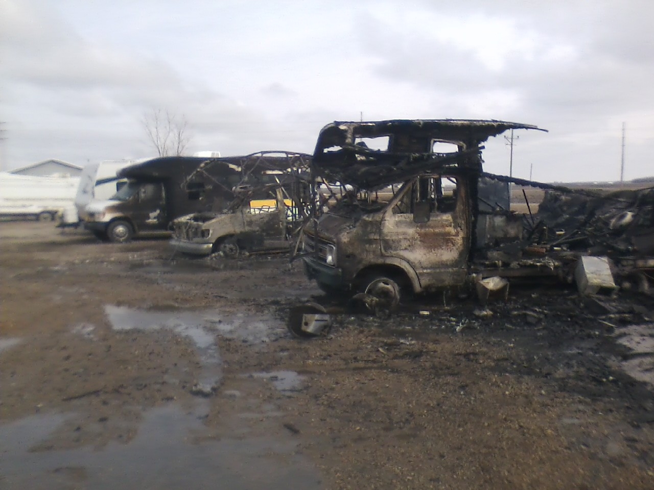 The fire was reported at Larson Storage, on highway 81 around 7am Fri. Wind caused the flames to spread to the other trailers and hampered efforts to knock down the fire.